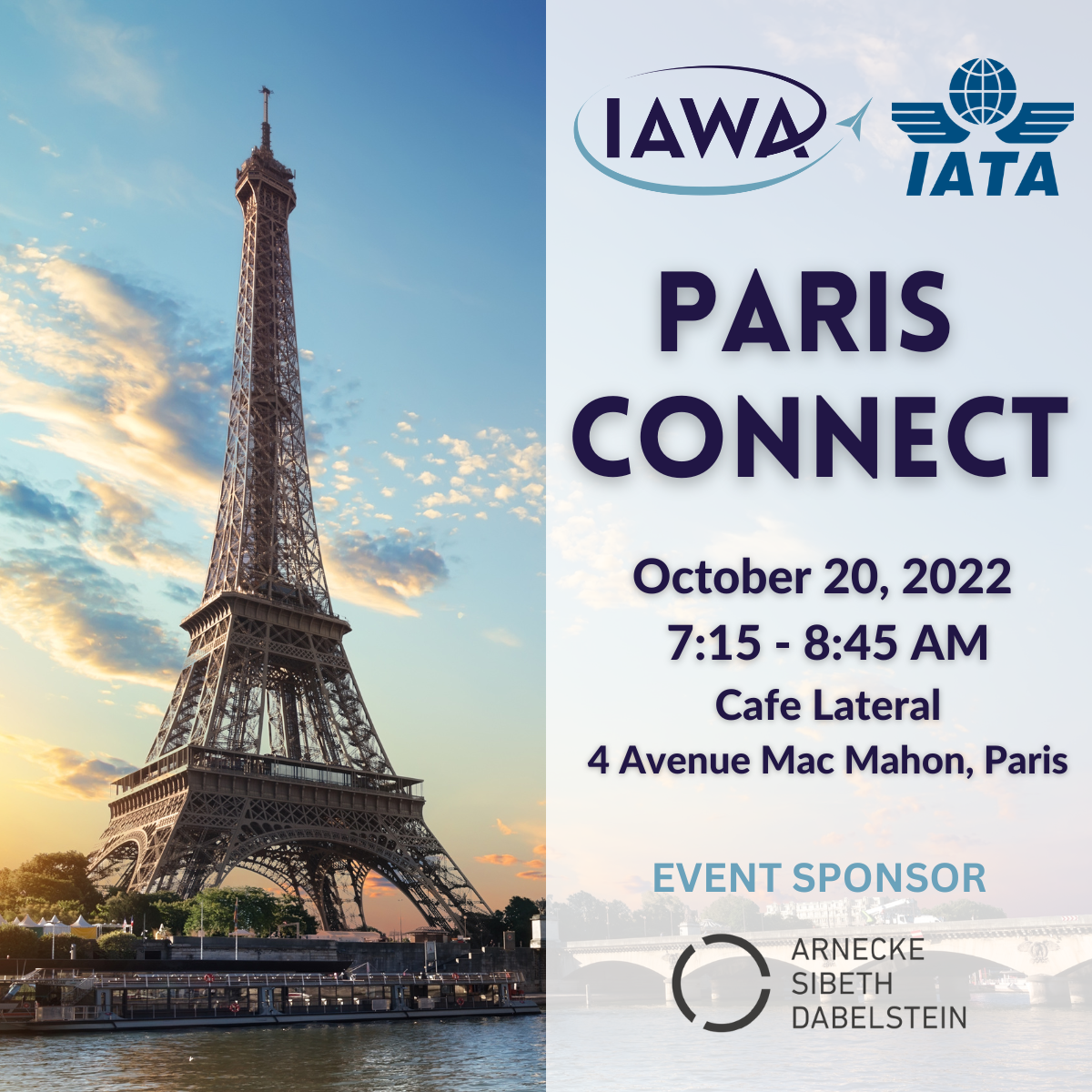 Please join IAWA, in partnership with IATA, for a Breakfast Connect at the IATA Legal Symposium in Paris, France. This event will take place at the Cafe Lateral (4 Avenue Mac Mahon, 75017 Paris) from 7:15 AM to 8:45 AM.